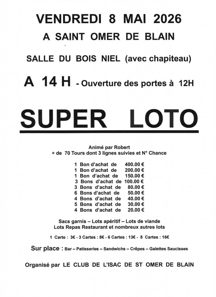 Loto animé par ROBERT, gros lot: bon d'achat de 400€, nombreux lots